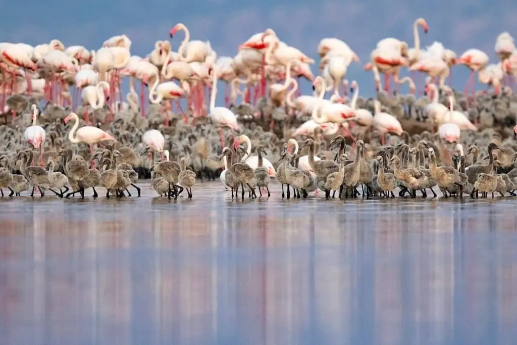 纳特龙湖最引东谈主贵重标“住户”是小红鹳(学名:Phoenicopterus minor)。该地区是东非小红鹳数目最多的场地,亦然东非唯独一处小红鹳如期孳生的形状,生效孳生的季节会罕有十万只雏鸟破壳而出。小红鹳腿部坚强的皮肤和鳞片能保护它们免受碱性湖水的灼伤,它们头部的腺体还能排出水中的盐分。它们以湖中的微生物为食,并在湖中酿成的小岛上筑巢。收货于这里的致命环境,捕食者无法围聚雏鸟,因此雏鸟能安全成长。有时,牺牲的小红鹳会被湖水的碱性保存下来,看起来就像变成了石头,酿成一都诡异而秀丽的情状。