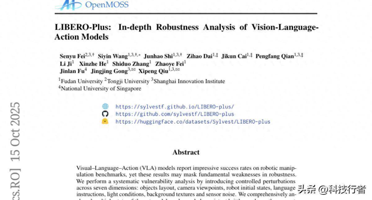 复旦大学的费森宇、王想言、施俊豪等磋议团队,集左券济大学、上海更动磋议院以及新加坡国立大学的磋议东说念主员,在2025年10月发表了一项颠覆性磋议,论文编号为arXiv:2510.13626v1。这项磋议就像是给咫尺火热的"视觉-言语-举止"(VLA)AI机器东说念主作念了一次全面体检,罢了却令东说念主大跌眼镜——那些在测试中阐明优异的AI机器东说念主,施行上就像是应试讲授培养出来的"高分痴呆"学生,只会背法度谜底,一朝碰到稍有变化的情况就安坐待毙。