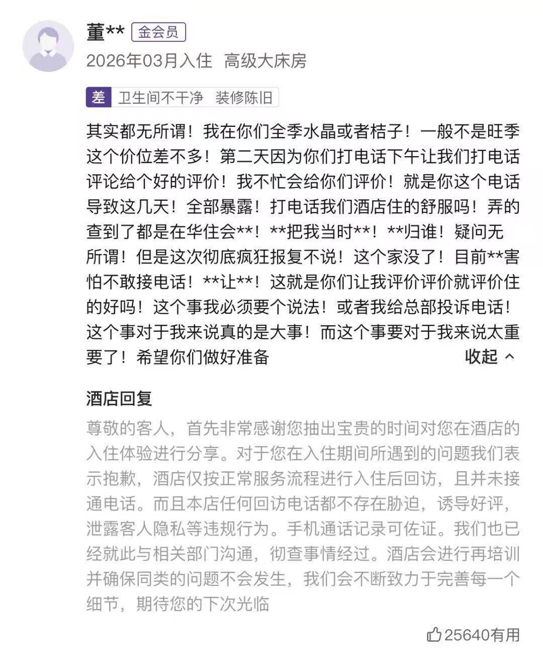 据媒体报谈,大同政务大厅万达广场桔子水晶栈房的评价笃定中出现一条差评。账堪称号为“董xx”的金会员于2026年3月入住,留言称:“第二天因为你们打电话下昼让咱们打电话指摘给个好评,即是你这个电话导致这几天!沿路表露……这即是你们让我评价评价就评价住的好吗!这个事我必须要个说法!”下方“栈房回复”称,栈房按正便行状经过回拜,且并未接通电话,并暗示手机通话纪录可佐证,将彻查事情经过。华住会客服则暗示,不存在指摘中所存在的问题,平台也不会法例门店对客户进行回拜。